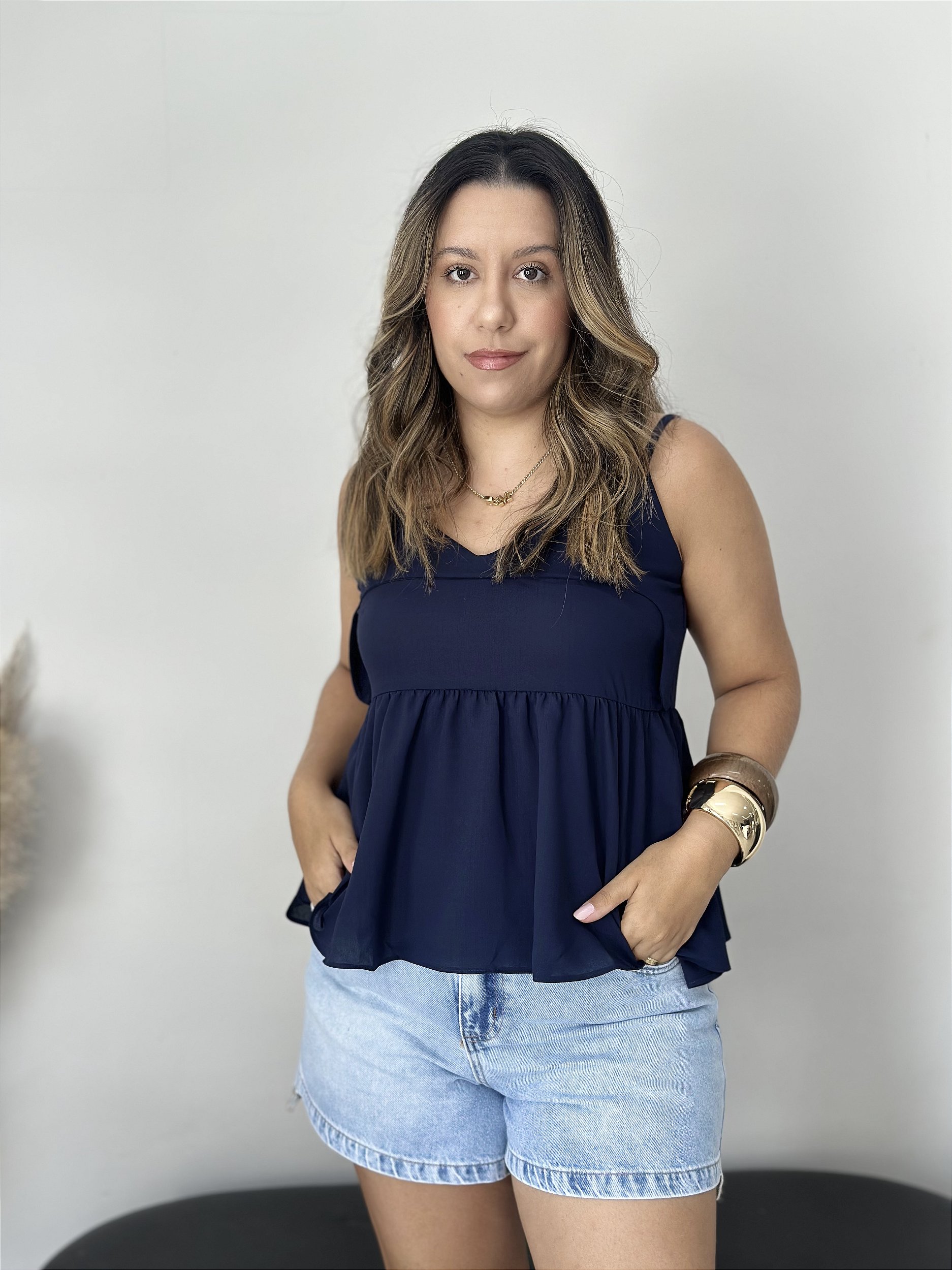 Detalhes: blusa com alcinha regulável, detalhe no colo, costura abaixo dos seios, desce evasê, a verdadeira bata. Fecho de botões dourados atrás. Sem elastano