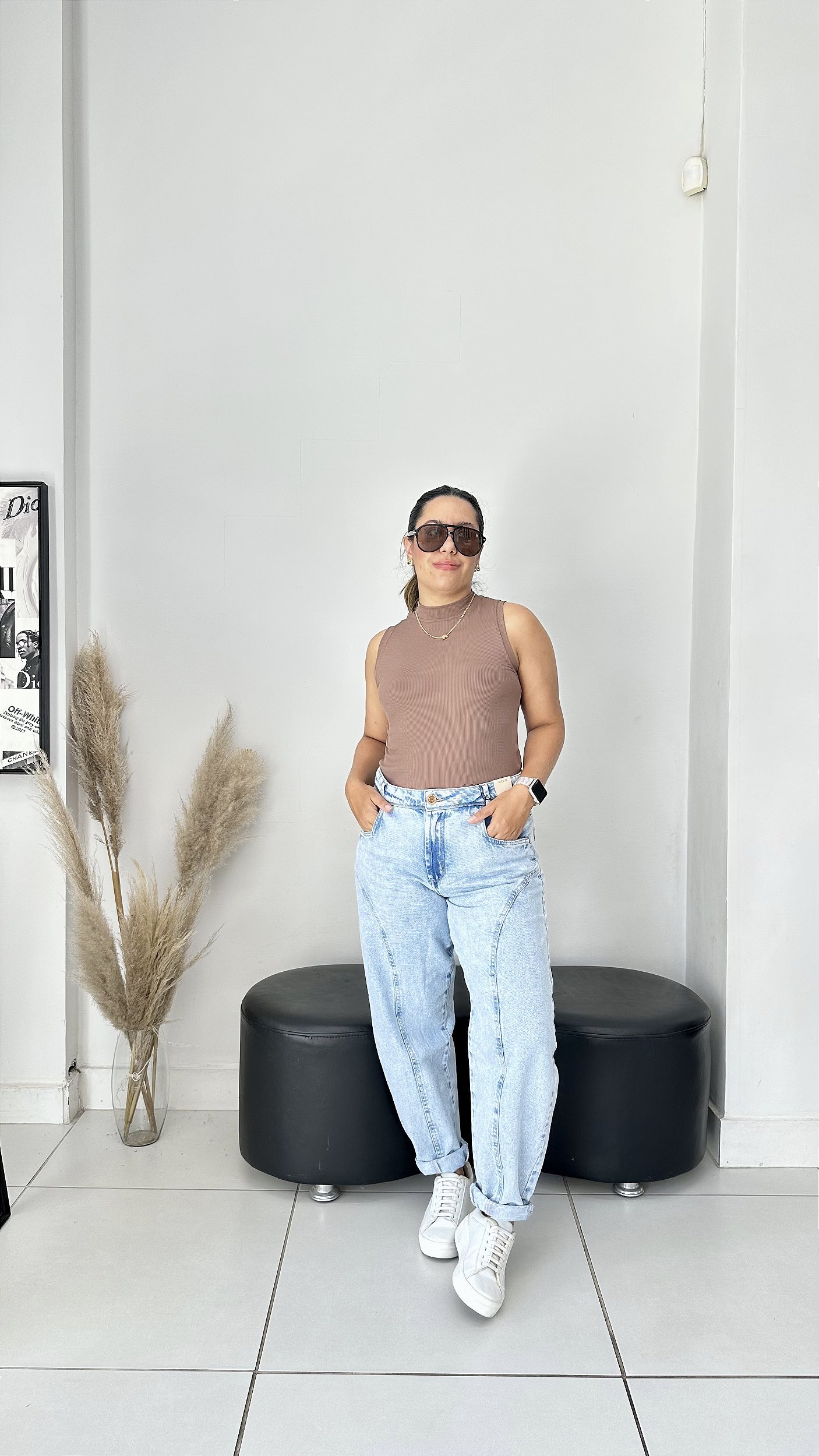A calça alicate é super diferenciada e a protagonista do look. Use com rasteira, salto ou tênis.