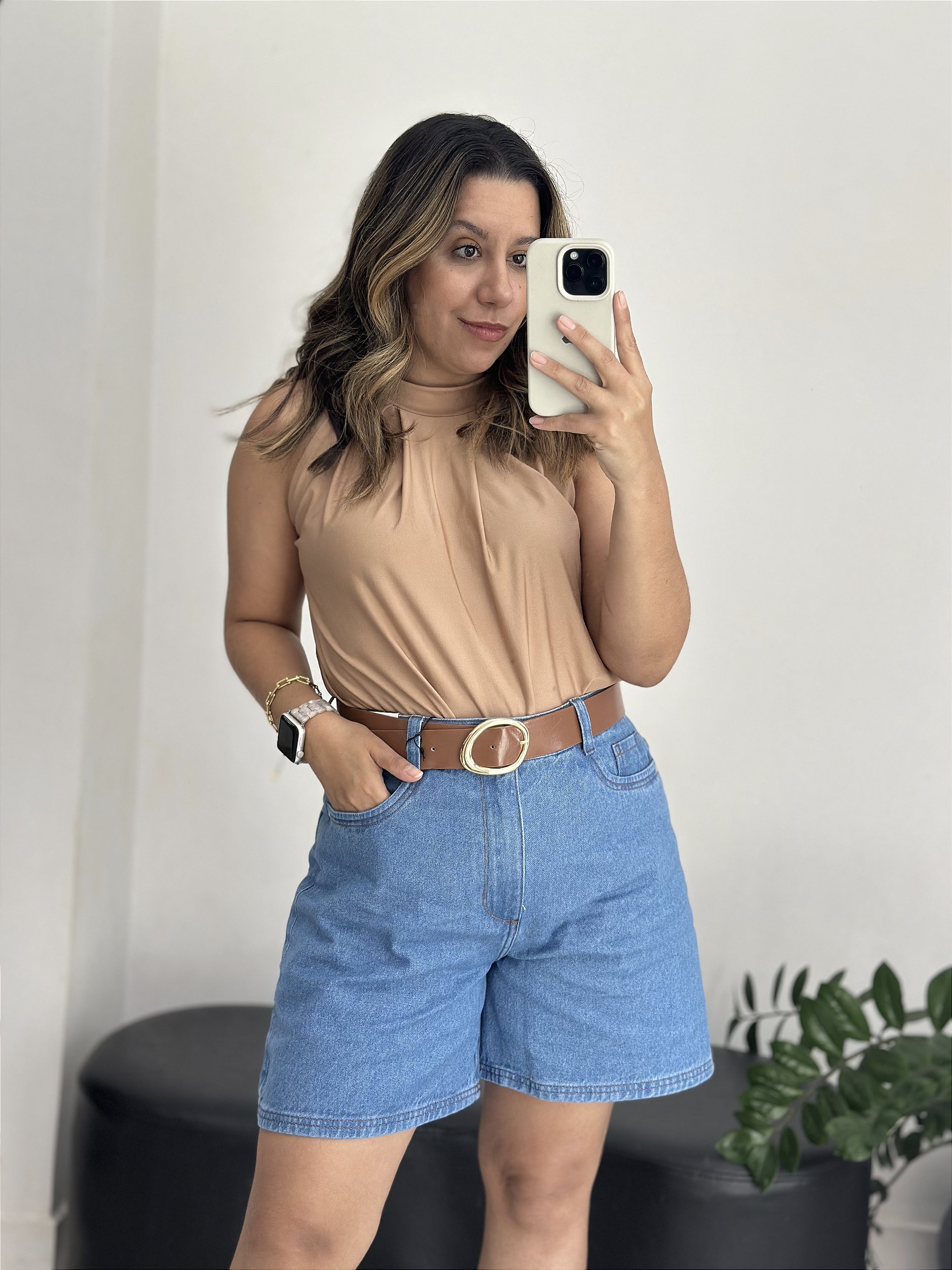 Bermuda meia coxa, pernas mais largas. COS alto, jeans 100% algodão sem elastano. A peça vai laciar quando usada, e colar ao normal quando lavar.