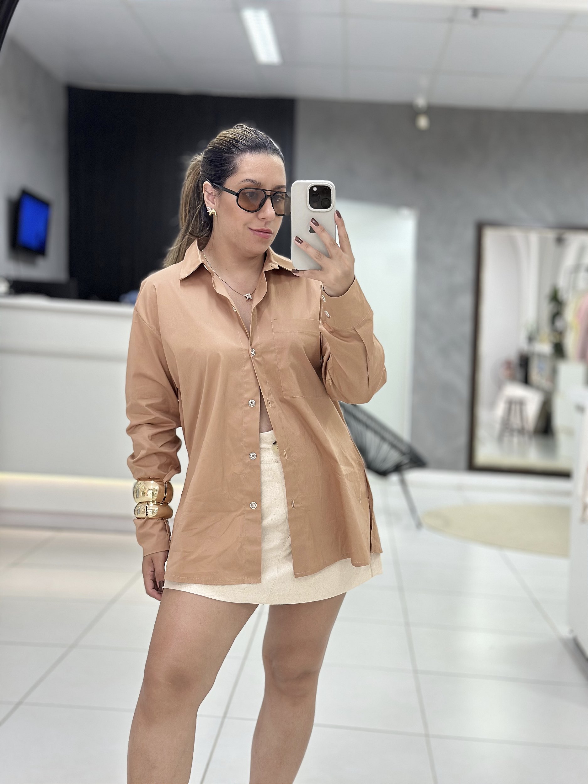 Camisa em tricoline, com elastano, modelo over (mais comprida) P veste busto 38/40 M veste busto 42 G veste busto 44.