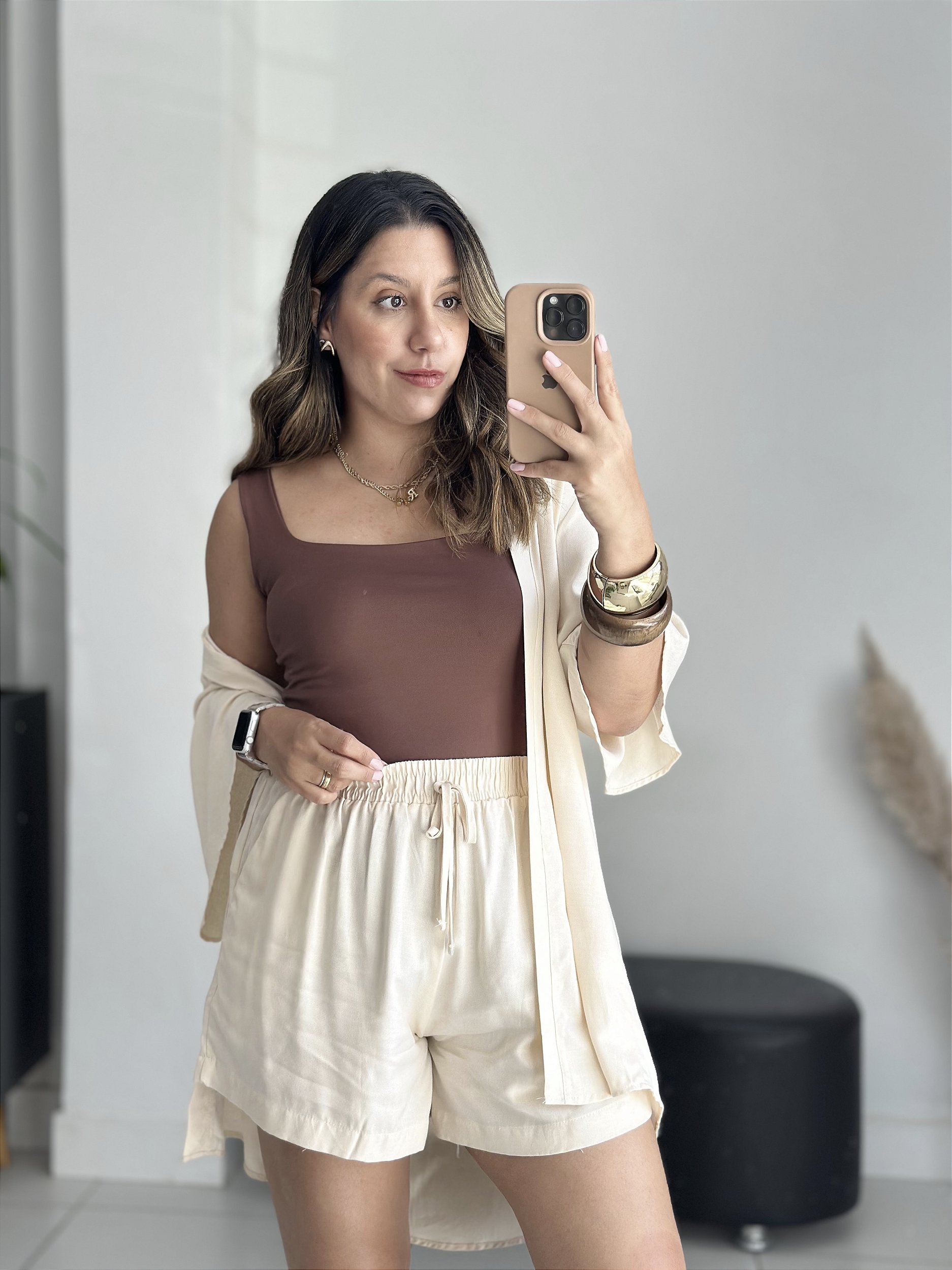 Conjunto em viscose estampada, shorts com elástico e bolso faca. Kimono alongado amplo.