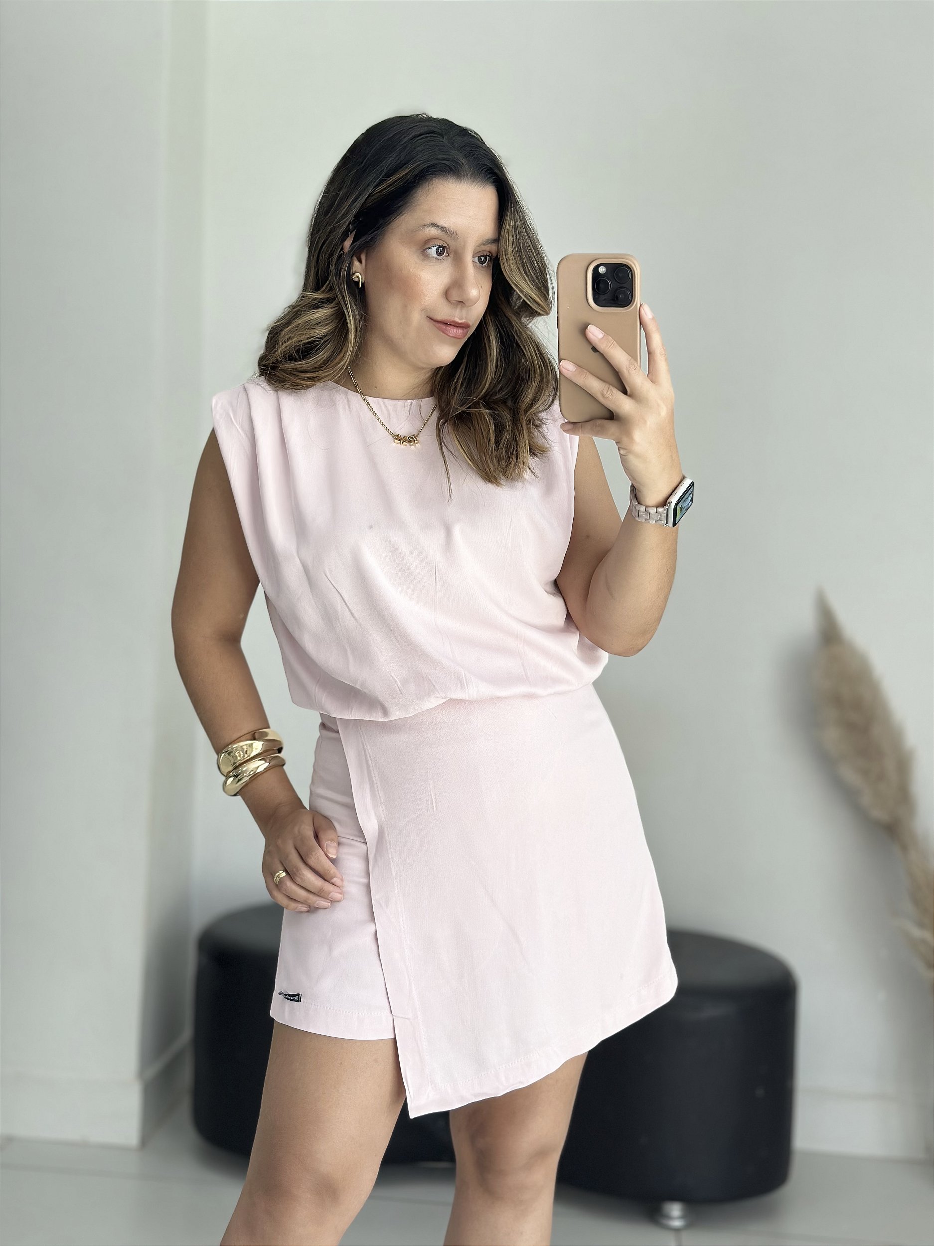 Detalhes: macaquinho estilo Musclec porém com pregas nos ombros que dão essa impressão, com costura separado blusa e shorts saia, saia transpassada e shorts em baixo e atrás, fecho em zíper e botão atrás.