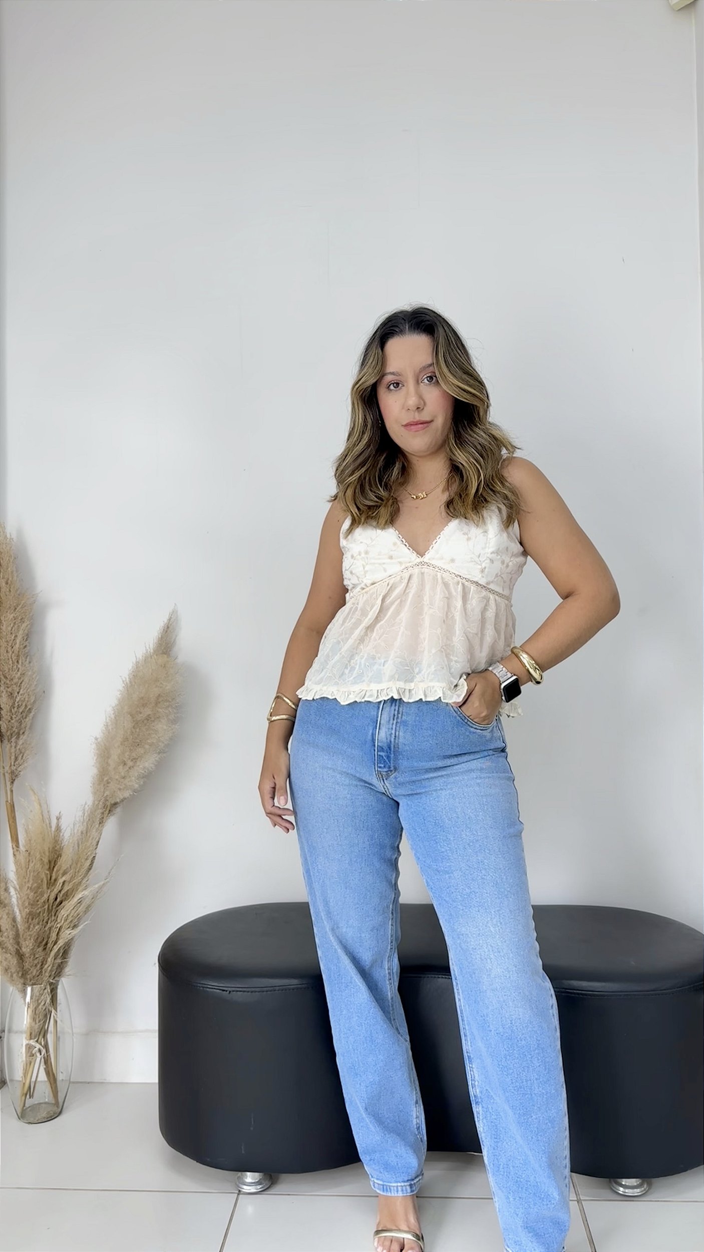 Detalhes: calça corte reto, com cos alto, bolso frontal e traseiro. Botão prata, e costura caramelo. Modelo mais largo nas pernas