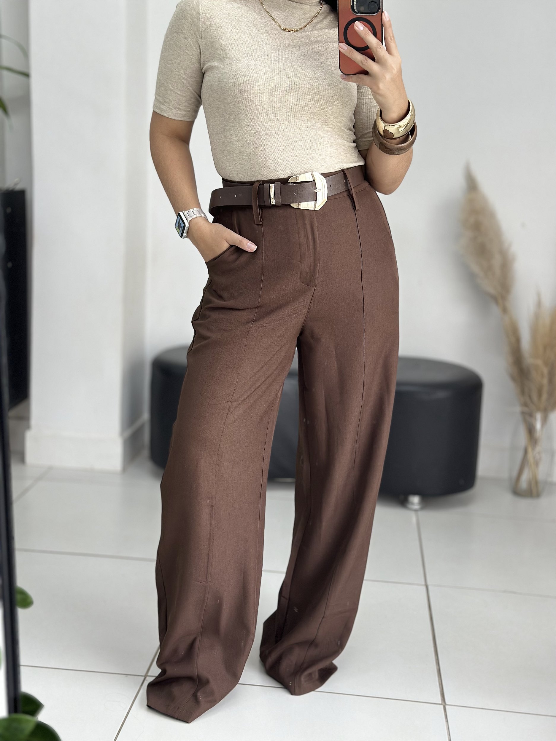 Detalhes: Calça pantalona, com costura na frente, passantes largos, bolso frontal, e já acompanha cinto.