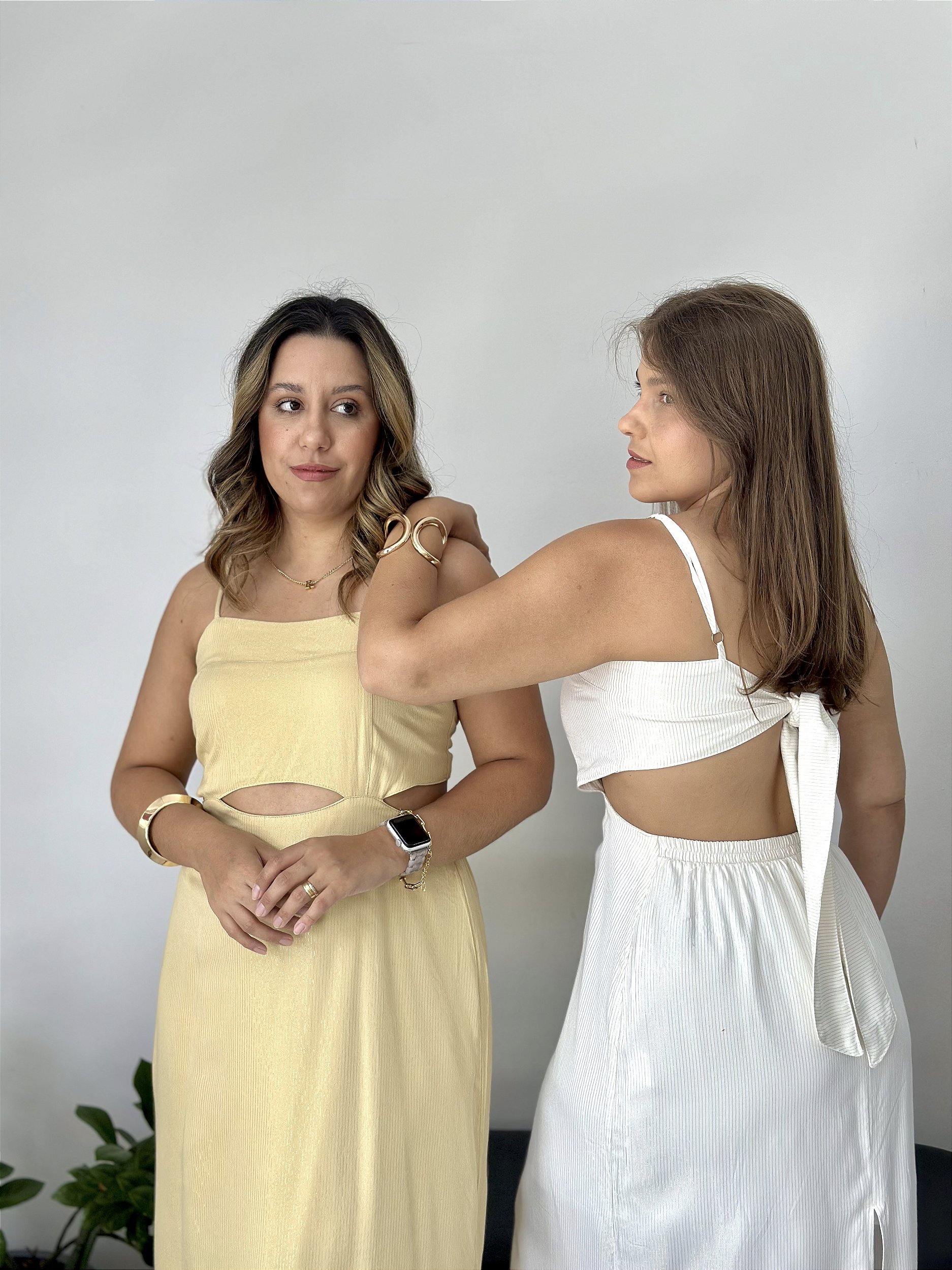 Vestido em viscose com fios de lurex! Com detalhe na cintura. Alças reguláveis, elástico nas costas e forro!